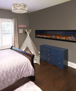 Napoleon’s Alluravision 74 inch linear electric fireplaces stand out from the rest with their nearly frameless viewing area that highlights the unique flame colors. The Alluravision 74 Deep features a soft fade in and out when turned on and off and they can be used as a heater at any time with or without the flame being on. Set the mood with yellow, orange, blue and multicolor flames with the push of a button. Easy to use, this electric fireplace is plug and play – just hang on the wall and plug it in. The Alluravision 74 Deep can also be hardwired to 120V or 240V. The accent lights and driftwood logs with topaz glass embers make beautiful additions to the deep model. Napoleon’s Alluravision Series linear electric fireplaces are about adding the fireplace, and not the frame to your favorite room.