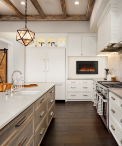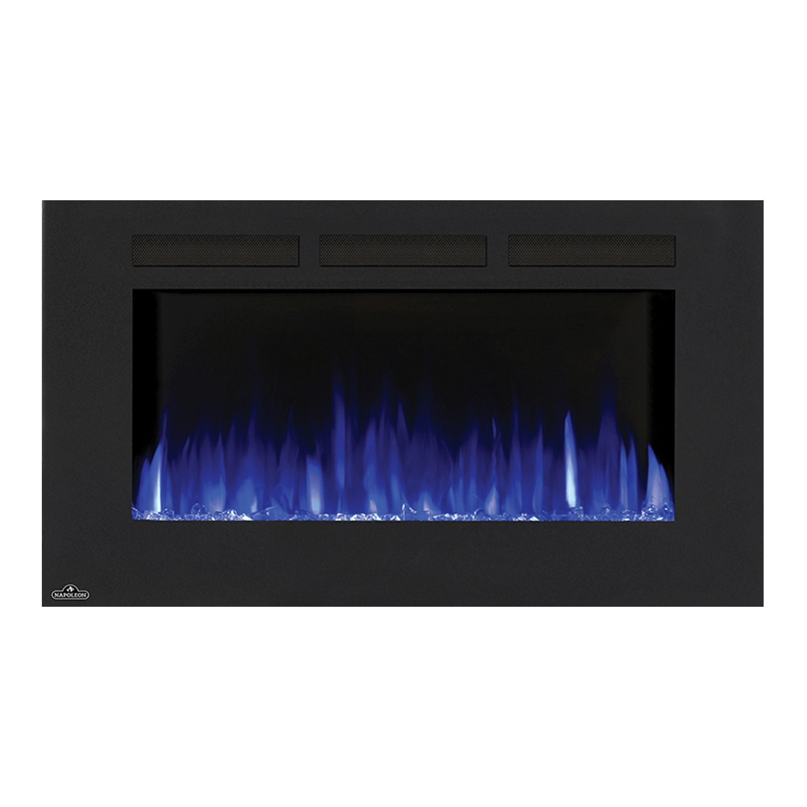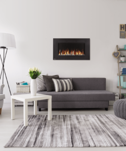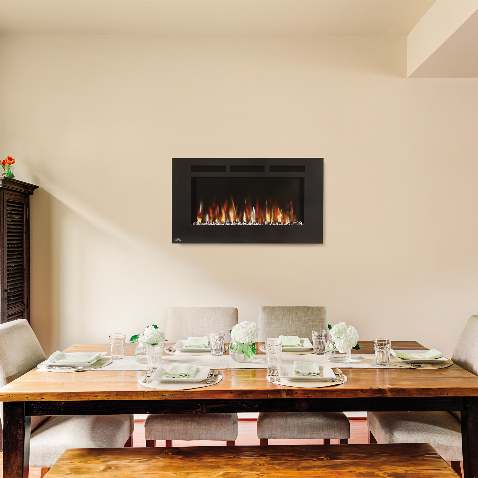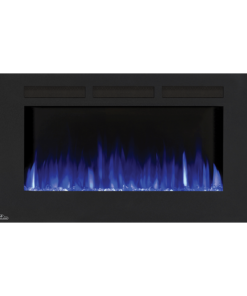 The Napoleon Allure 42 Electric Fireplace puts out an incredible 5,000 BTU’s, heating rooms up to 400 sq. ft. The glittering glass ember bed sparkles from the multicolored flames that you control with the touch of a button. Traditional orange, or cool blue flames, and a combination of the two will set the mood every time. You don’t need a specialist or a gas fitter for installation, just hang on the wall and plug in for an instant transformation. The 5″ depth means that this fireplace doesn’t intrude into your living space, but simply accents it. Place the Allure 42 electric fireplace anywhere you want to make a huge impact; it’s ideal for every room in the house.
